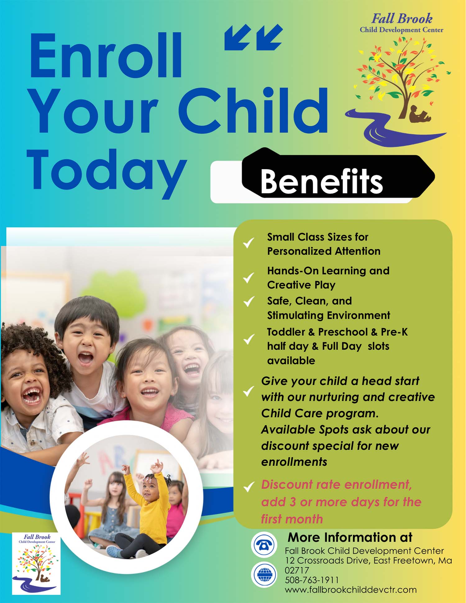 At Fall Brook, we understand that your demanding jobs provide a livelihood for your family Fall Brook operates from . To serve your family better, we operate from 7 a.m. until 5 p.m. to make sure that your work schedule doesn't prevent you from choosing a quality early education for your child. Call us today to learn more about our after school care in East Freetown, MA.
